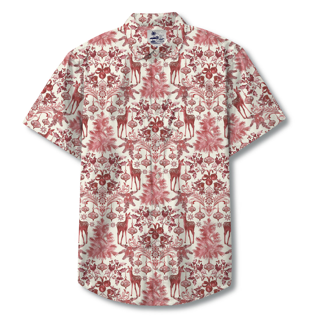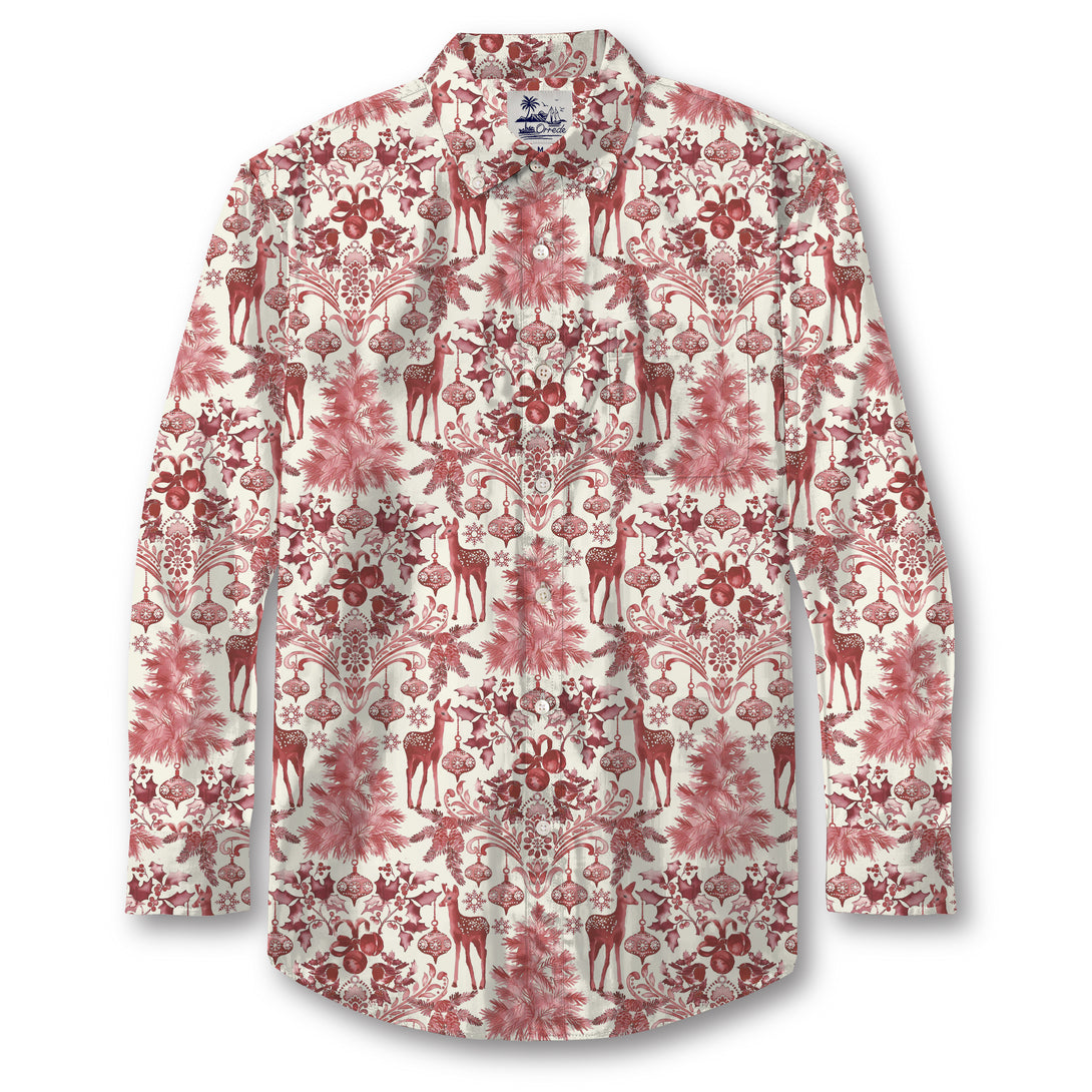 This shirt features an intricate, symmetrical toile-style pattern in deep red tones against a soft cream background. The design combines natural and festive elements, including elegant deer, pine branches, holly, and ornamental floral motifs. The overall look evokes a refined, vintage charm with a touch of holiday spirit, blending classic nature-inspired illustrations with ornamental detailing.